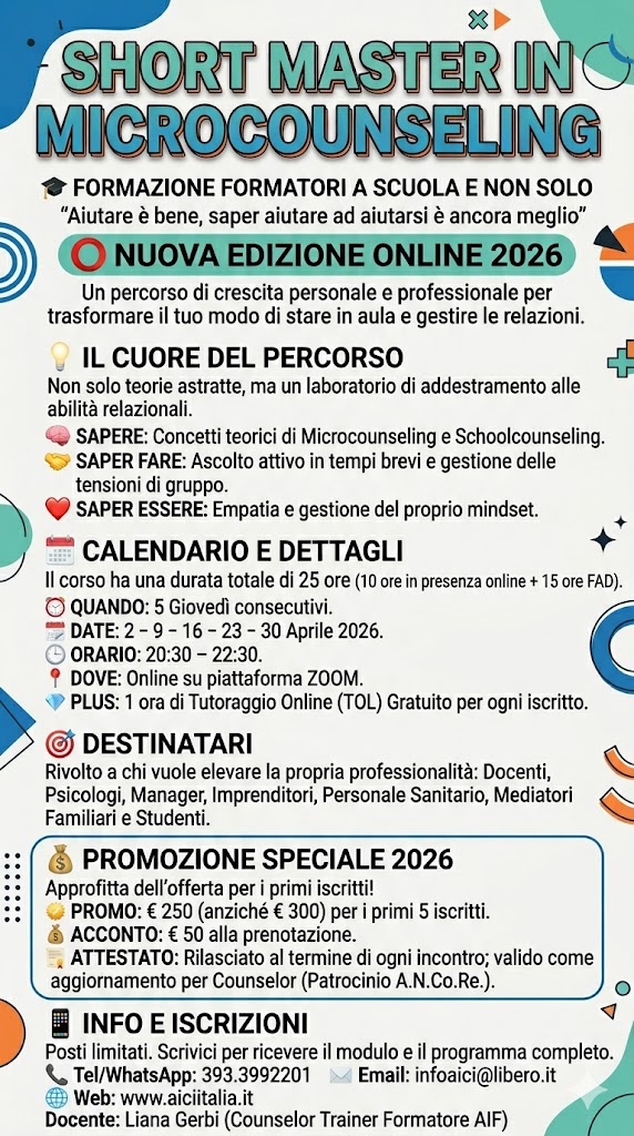 Sono felice di annunciare l'apertura delle iscrizioni per il corso di Micro-Counseling (AIF), pensato per docenti e formatori che desiderano acquisire strumenti pratici di comunicazione e gestione della relazione educativa.
