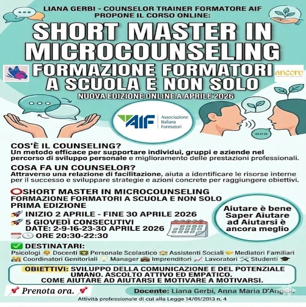 Liana Gerbi – Counselor Trainer Formatore AIF – propone il corso online: "Short master in microcounseling formazione formatori a scuola e non solo. "Aiutare è bene Saper Aiutare ad Aiutarsi è ancora meglio" La COMUNICA-AZIONE è un'ABILITA' e come tutte le abilità necessitano di approfondimenti per saperla gestire".
