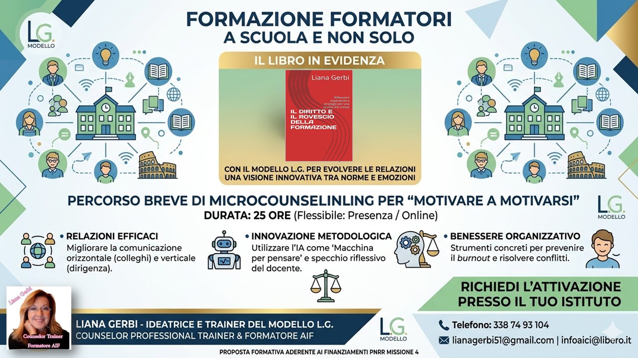 Il modello Formazione Formatori in Microcounseling L.G. ideato da Liana Gerbi aiuta la persona ad aiutarsi a trovare "SOLUZIONI A PROBLEMI " e a incamminarsi verso obiettivi personali e professionali.