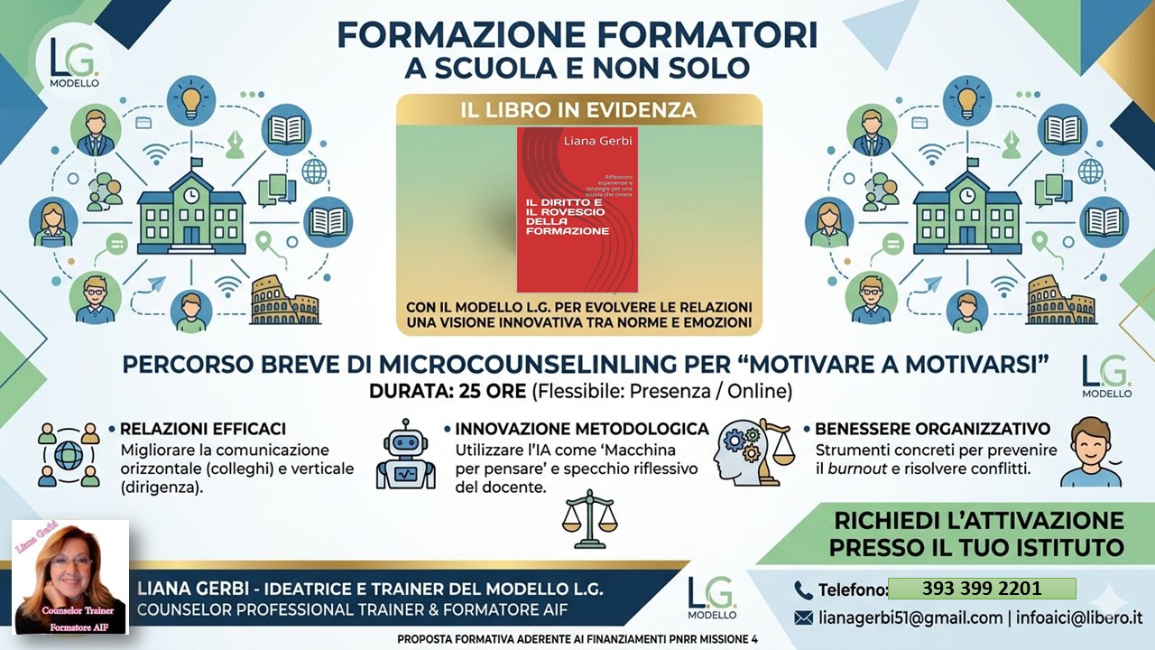 Liana Gerbi – Counselor Trainer Formatore AIF – propone il corso online: "Short master in microcounseling formazione formatori a scuola e non solo. "Aiutare è bene Saper Aiutare ad Aiutarsi è ancora meglio" La COMUNICA-AZIONE è un'ABILITA' e come tutte le abilità necessitano di approfondimenti per saperla gestire".